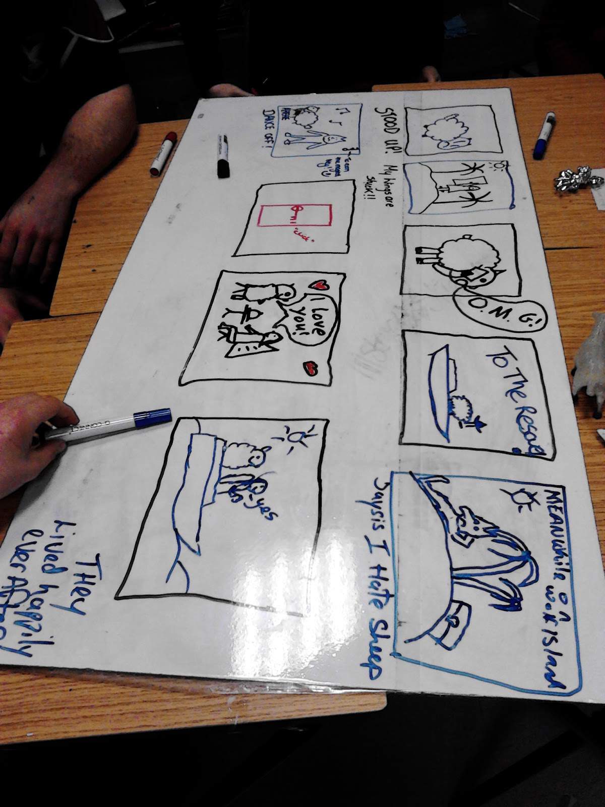 The group are then asked to create a story using the objects. The story-making process can use the objects real meaning or their altered meaning. The story is constructed using the 'storyboard' planning technique. The story can be fanciful and ridiculous. The groups share their stories with the other groups. The whiteboard can be shown to the group as the story is being told.